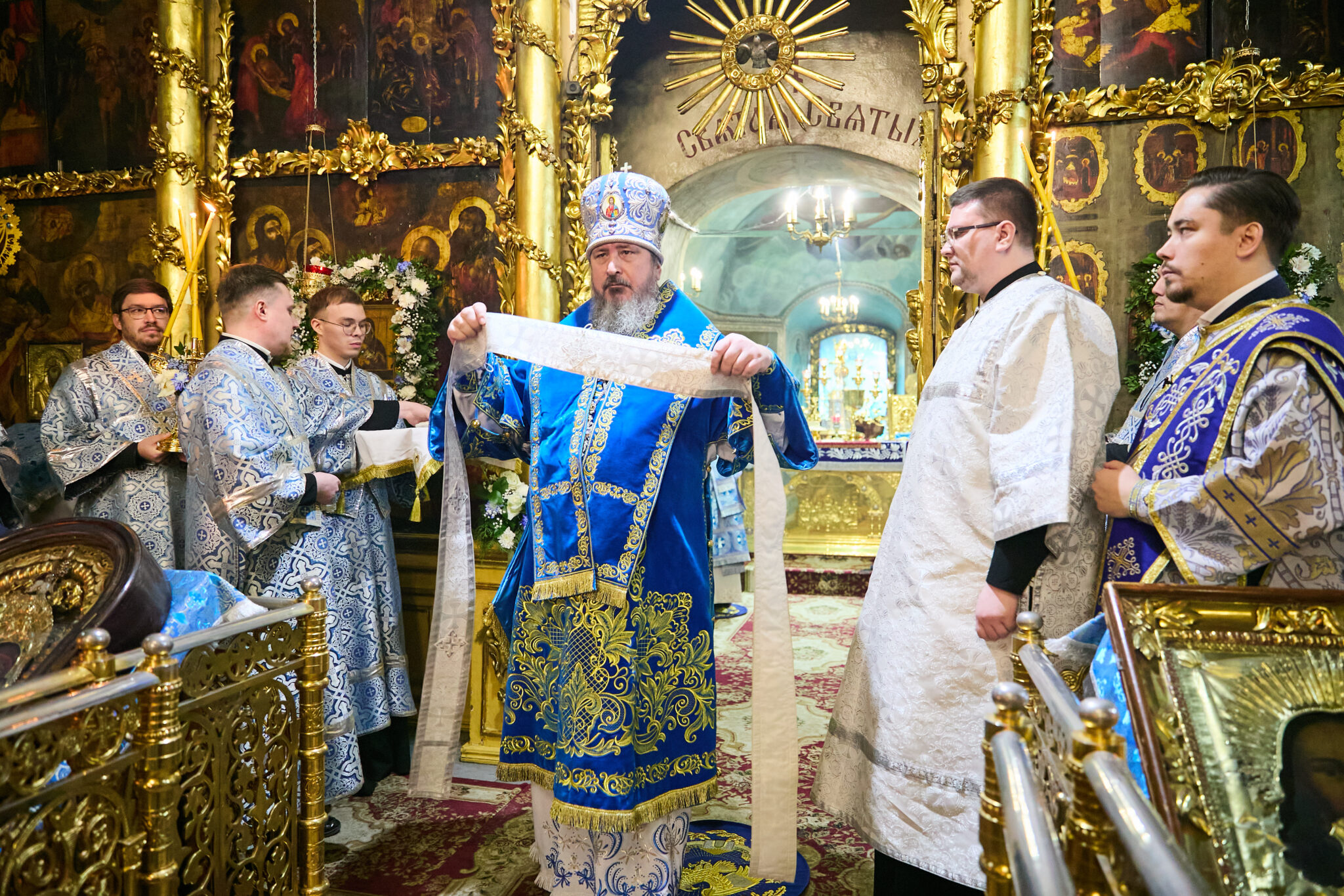 Его Высокопросвященству сослужили игумен Виталий (Гришин) и клирики собора руководитель воскресной школы при кафедральном соборе иерей Максим Подшибякин и иерей Алекcандр Михайлов. Диаконский чин возглавил диакон Евгений Поляков.